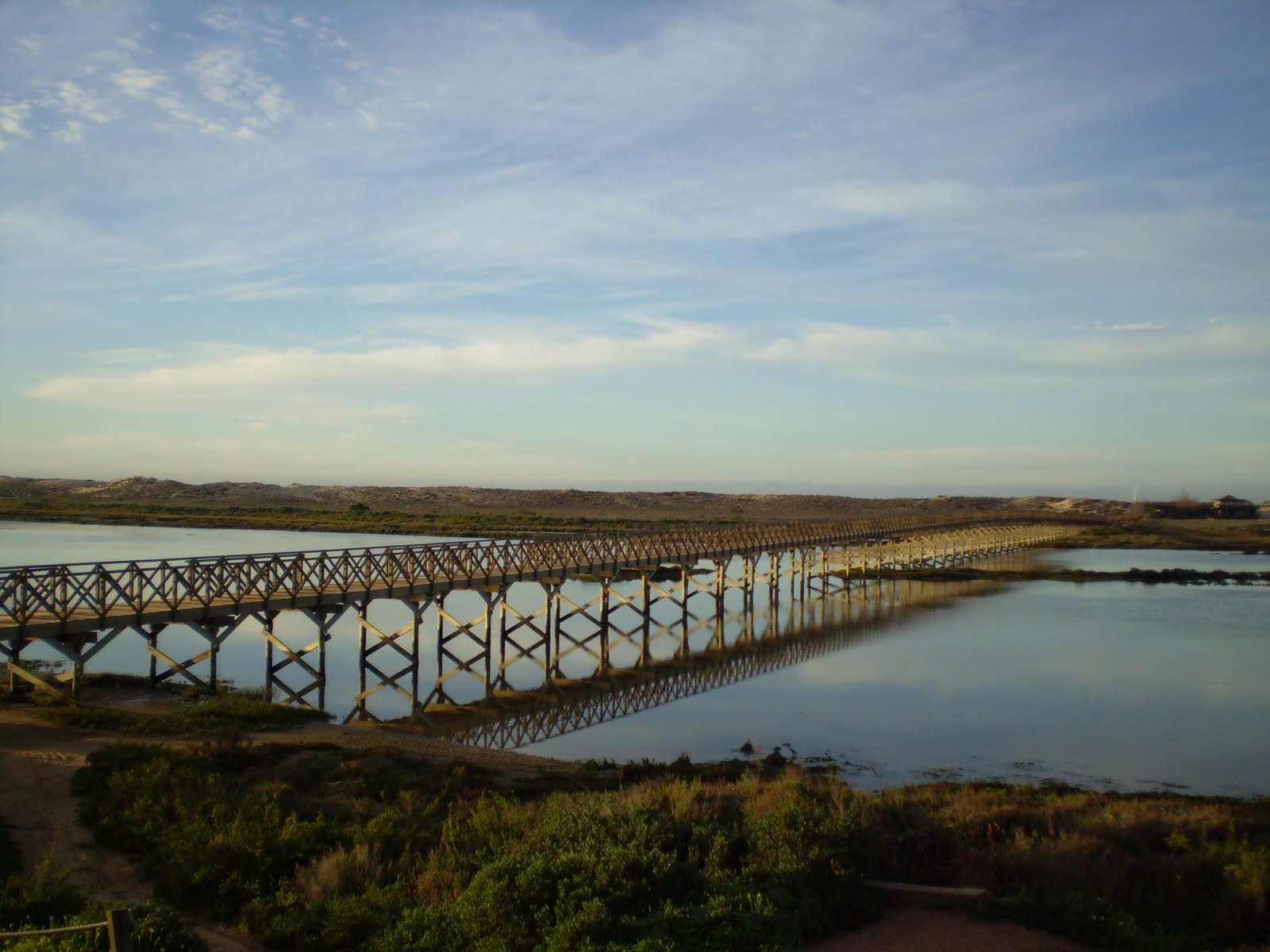 sem rochas, com acesso pedestre por meio de uma ponte sobre a Ria Formosa, de